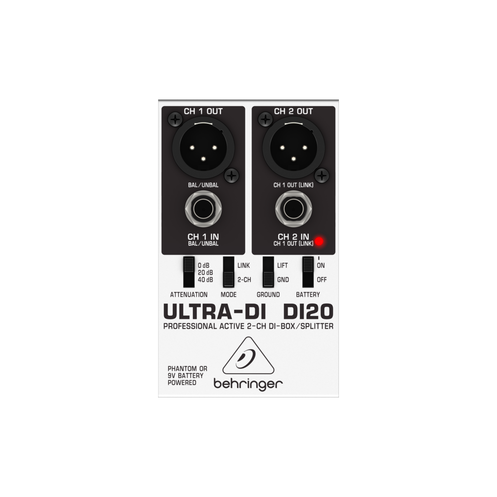 Директ-бокс ULTRA-DI DI20 – профессиональный инструмент звукообработки для сценической и студийной работы. Поддерживающее работу от встроенной батареи или от внешнего источника фантомного микрофонного питания, оснащённое высококачественными TRS и XLR коннекторами, имеющее наглядную панель управления и прочный, легко выдерживающий испытание гастролями металлический корпус. ULTRA-DI DI20 имеет два основных режима работы – двойного монофонического преобразования и разделения сигнала. Они реализовываются путём различного перенаправления сигнала между входными и выходными разъёмами. В первом случае небалансный сигнал, поданный на два ¼-дюймовых TRS-разъёма, преобразуется в балансный и подаётся на два соответствующих XLR выхода. Во втором сигнал, поданный на первый вход, без изменений подаётся на второй TRS-разъём, работающий в этом режиме как выход, и дублируется как балансный на оба XLR выхода. Этот алгоритм позволяет подключать к ULTRA-DI DI20 другие устройства, например, усилители.