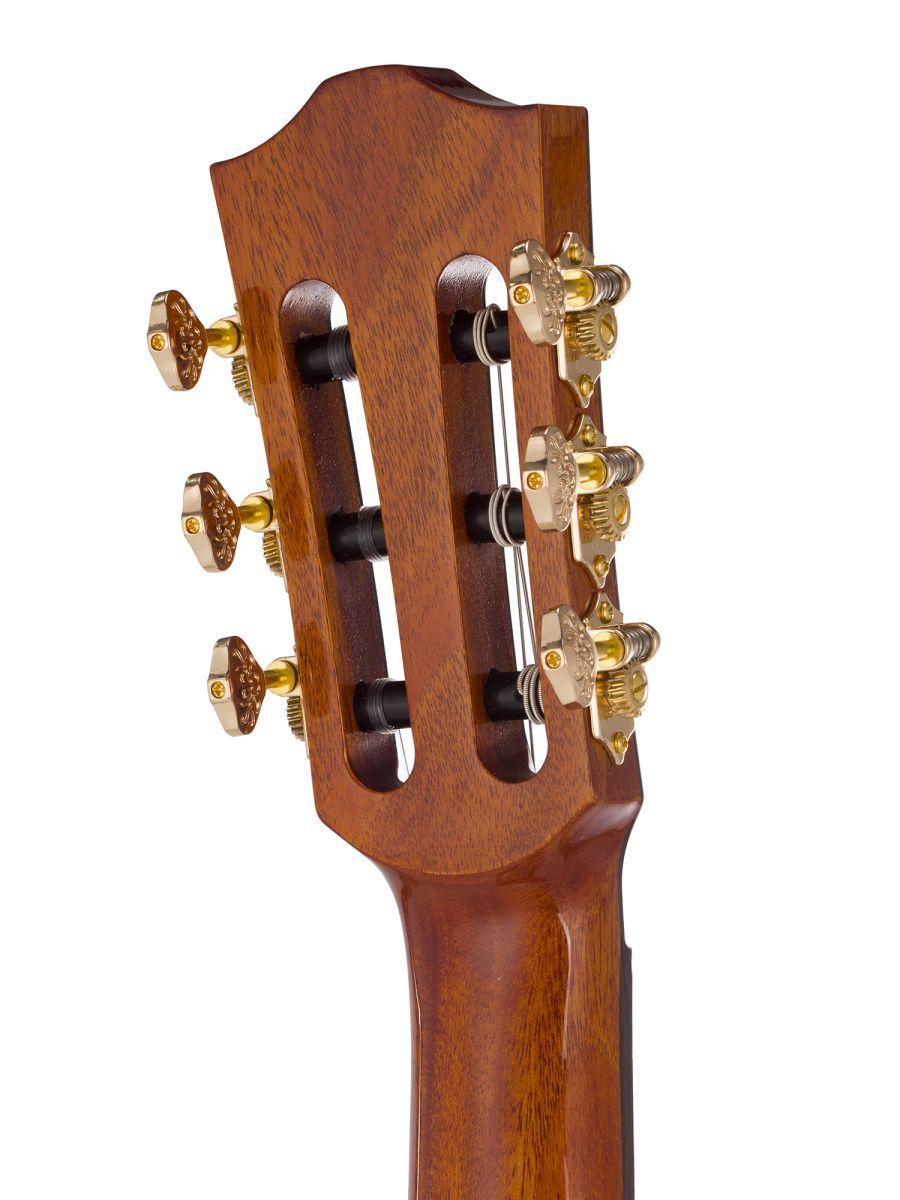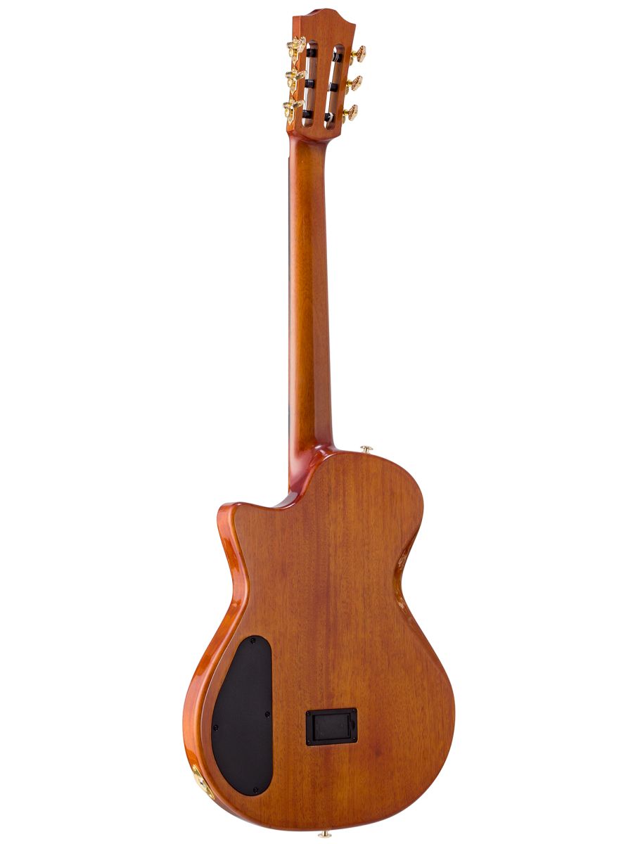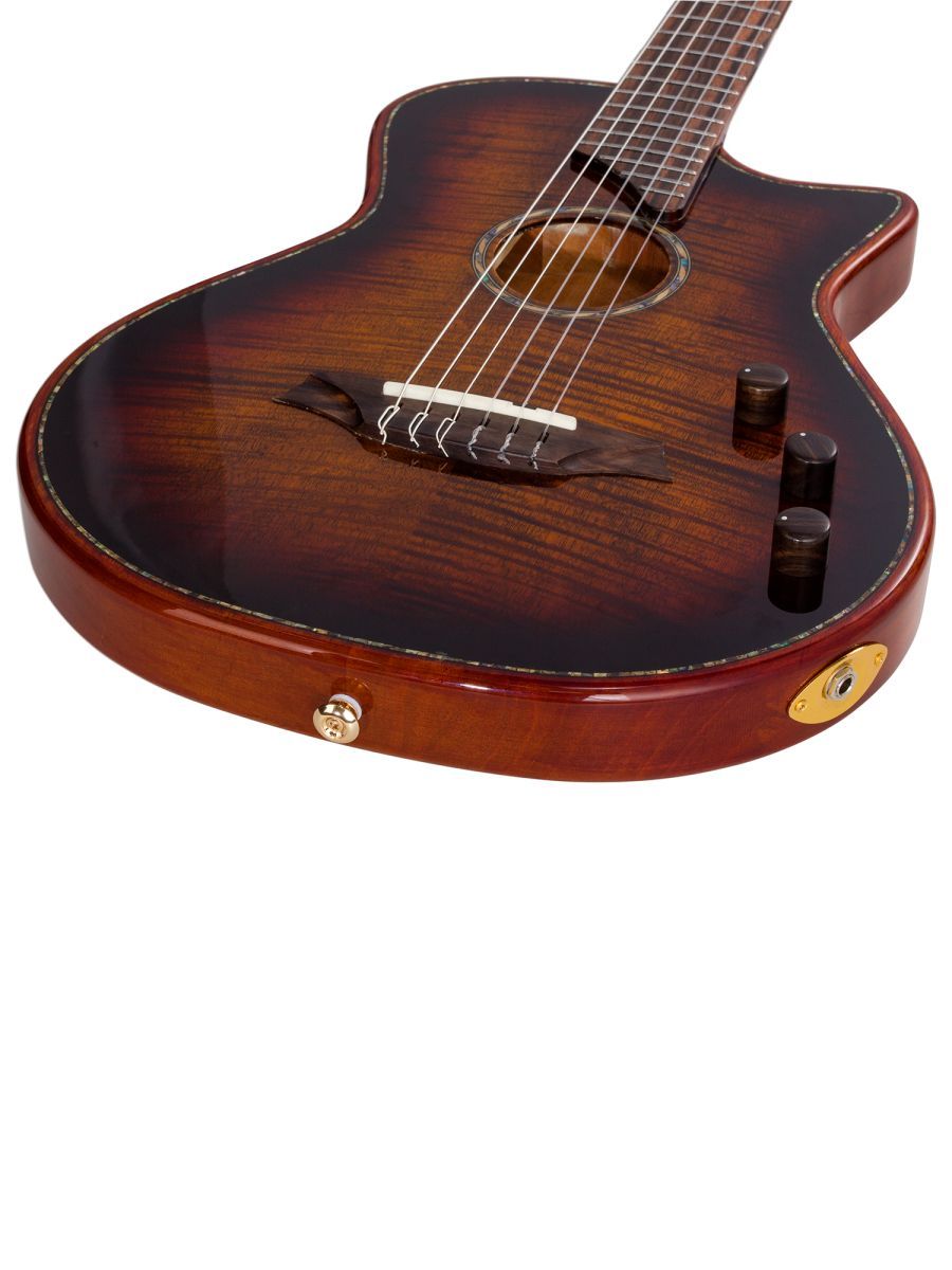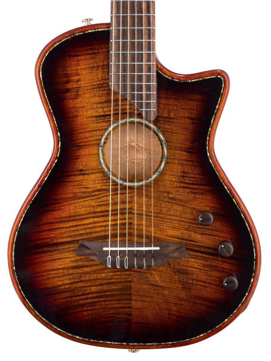 Bromo BEN2C3TS — полуакустическая гитара для музыкантов, ценящих универсальность, глубину звучания и премиальное качество. Модель сочетает традиции классического гитарного мастерства с современными технологиями звукоусиления. Корпус из махагони обеспечивает тёплый, насыщенный тон с выраженной серединой и отличной артикуляцией. Древесина известна стабильностью и долговечностью. Верхняя дека из массива ситхинской ели, облицованная слоем высококачественного огненного окуме класса 5A, не только обеспечивает чистый, выразительный тон, но и излучает экзотическую красоту, обогащенную потрясающе глубокой, волнистой текстурой древесины. Гриф из махагони с двухсторонним анкерным стержнем гарантирует стабильность геометрии грифа при перепадах влажности и температуры. Анкер позволяет точно регулировать профиль грифа для комфортной игры. Нейлоновые струны создают мягкий, бархатистый звук, характерный для классической гитары, снижают нагрузку на гриф и удобны для пальцевой техники. Винтажные колки «Mt. Bromo» обеспечивают плавность хода, высокую точность настройки и стабильность строя, позолоченное покрытие защищает от коррозии и придаёт инструменту элегантный вид. Гибридная электронная система (пьезодатчик + 3‑позиционный звукосниматель) позволяет передавать чистый акустический звук через пьезодатчик, выбирать оптимальный тембр с помощью 3‑позиционного переключателя, уверенно выступать на сцене и записывать в студии с минимальными искажениями. Глянцевое покрытие подчёркивает текстуру древесины, защищает инструмент от внешних воздействий и придаёт роскошный внешний вид. Утеплённый жёсткий кейс обеспечивает надёжную защиту от ударов, перепадов температуры и влажности при транспортировке и хранении. Bromo BEN2C3TS — это гармоничный сплав традиций и инноваций. Богатое звучание, надёжная конструкция, стильная внешность и удобная электроника делают эту гитару идеальным спутником для творчества на любом уровне.