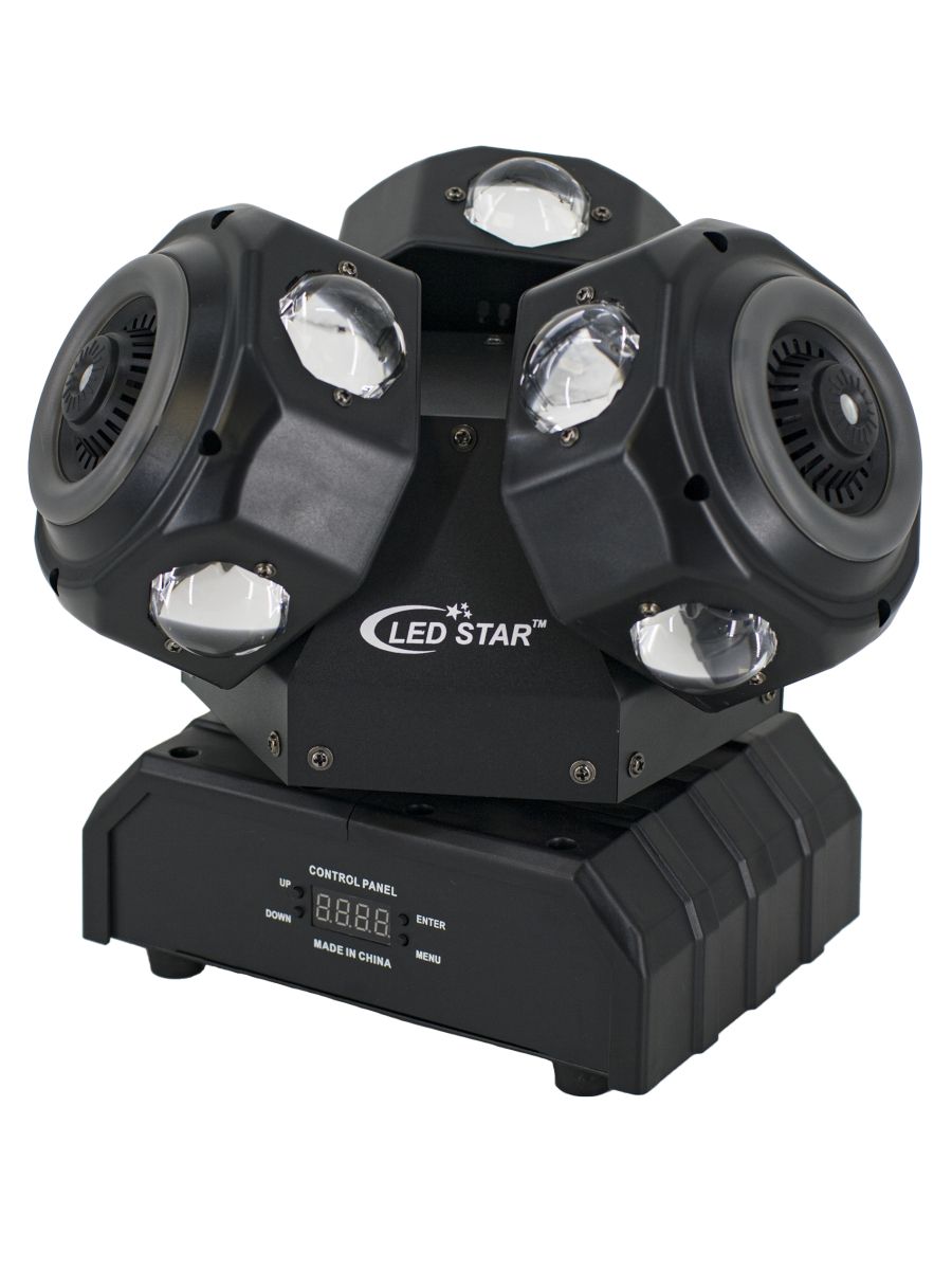 Led Star MA-E031 Вращающаяся светодиодная тройная голова, 200Вт, Beam 12*10Вт RGBW (3x4), Halo 3 кольца 12*0.2Вт RGB, Laser зеленый, красный, синий, авто, звуковая активация, DMX512, ведущий/ведомый, линейный диммер