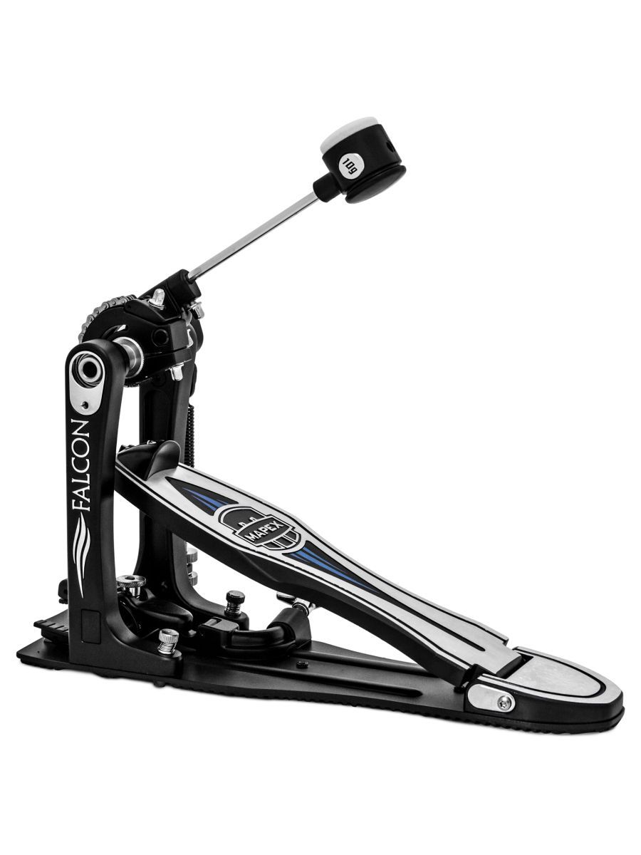 В течение двух лет специалисты отдела инновационных технологий компании MAPEX встречались с барабанщиками со всего мира, наблюдали за их игрой и спрашивали, что же является крайне важным для создания идеальной педали бас-барабана. Затем все ответы музыкантов были проанализированы, и на свет появилась великолепная новинка – педаль Falcon. Конструкция педали включает ряд особенностей: - Регулируемый упор для ноги, предотвращающий соскальзывание; - Регулировка угла наклона колотушки; - Регулировка угла наклона педали; - Сменная система привода, позволяющая переходить от цепного к ременному приводу в зависимости от вашего вкуса; - Эргономичность (основа педали Falcon занимает меньше места на полу, позволяя тем самым легко располагаться возле стойки для малого барабана и хай-хэта во время использования модели с двумя педалями); - Усовершенствованная платформа даёт ощущение более длинной основы; - Устойчивость; - Запатентованные шарниры для большей безопасности и точности всех движений.
